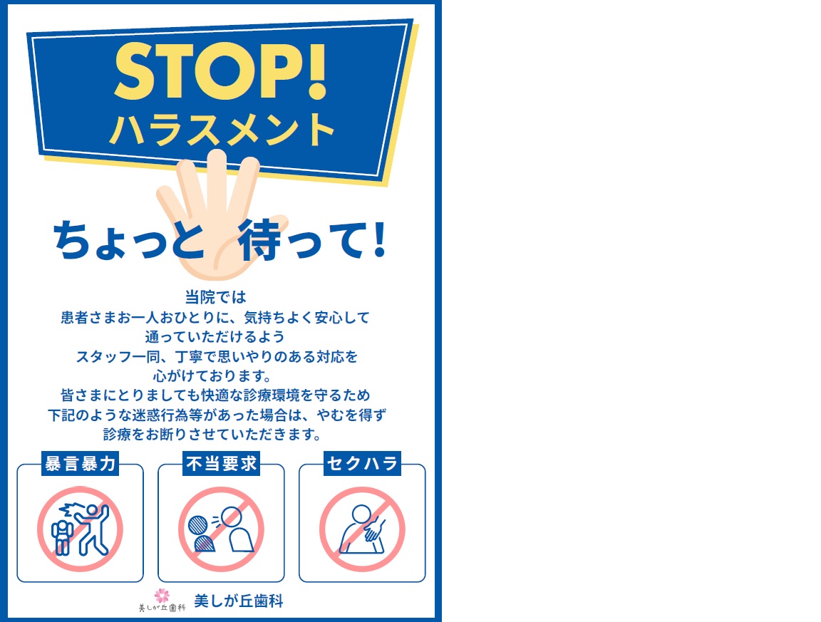 また、すべての患者さまに安心して通っていただけるよう、スタッフへの暴言や過度な要求などにはご遠慮いただいております。皆さまのご理解とご協力をお願い申し上げます。